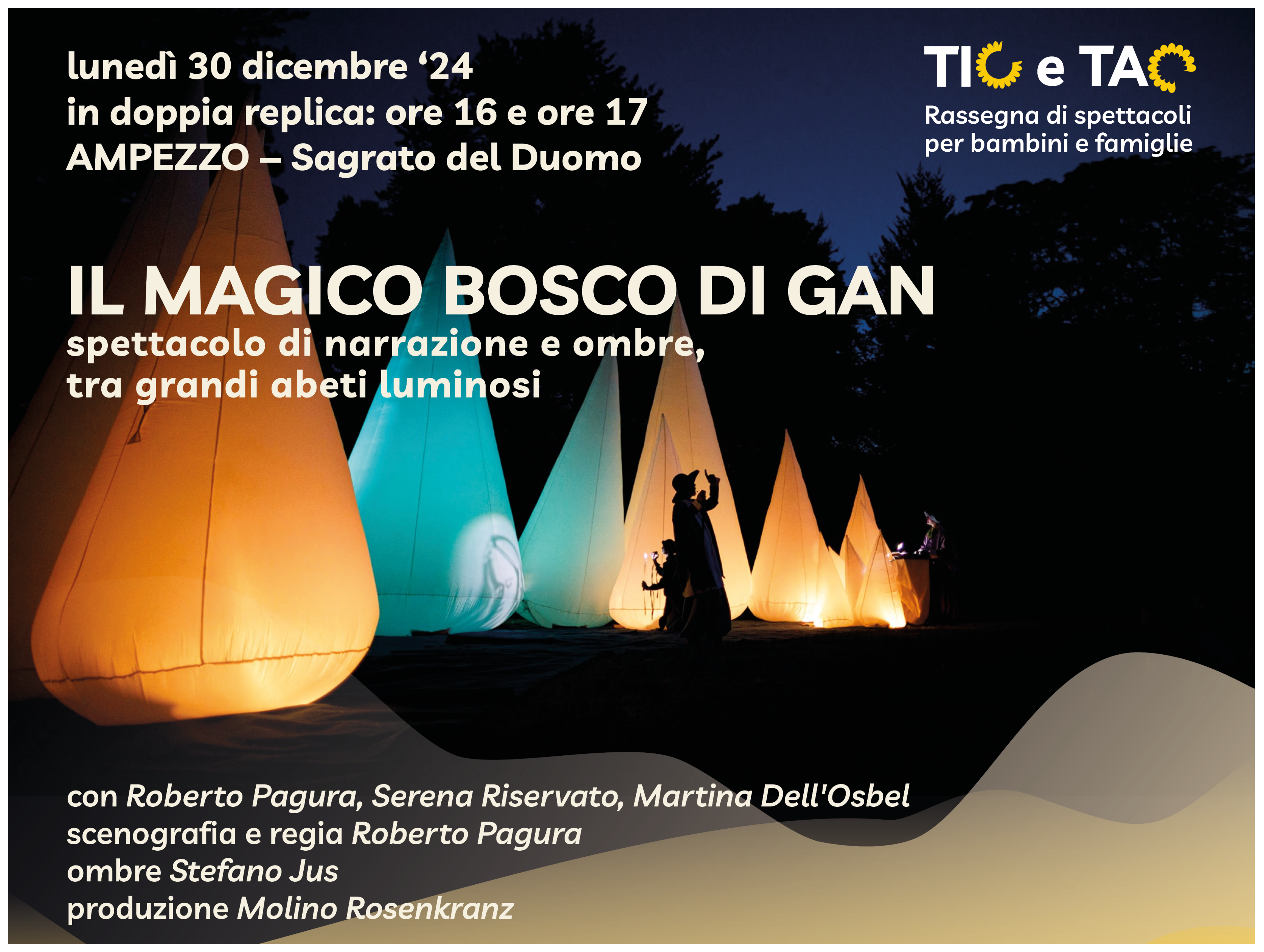 Un evento del Teatro della Sete, Il magico bosco di Gan, è in programma sul Sagrato del Duomo di Ampezzo il 30 dicembre in doppia replica, alle ore 16 e alle ore 17. Si tratta di uno spettacolo di narrazione e ombre, tra grandi abeti luminosi, con Roberto Pagura, Serena Riservato, Martina Dell’Osbel, scenografia e regia Roberto Pagura, ombre Stefano Jus produzione Molino Rosenkranz.