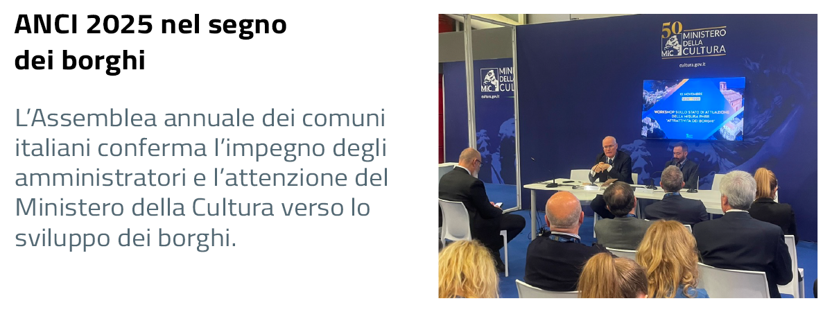 Si è conclusa lo scorso 14 novembre la 42ma Assemblea annuale dell’Associazione Nazionale dei Comuni Italiani. Nell’area espositiva di Bologna Fiere era presente anche il Ministero della Cultura con un proprio stand che, per tre giorni, è stato il centro di gravità del dibattito sul ruolo della cultura per i Comuni e, in particolare, per i borghi italiani.